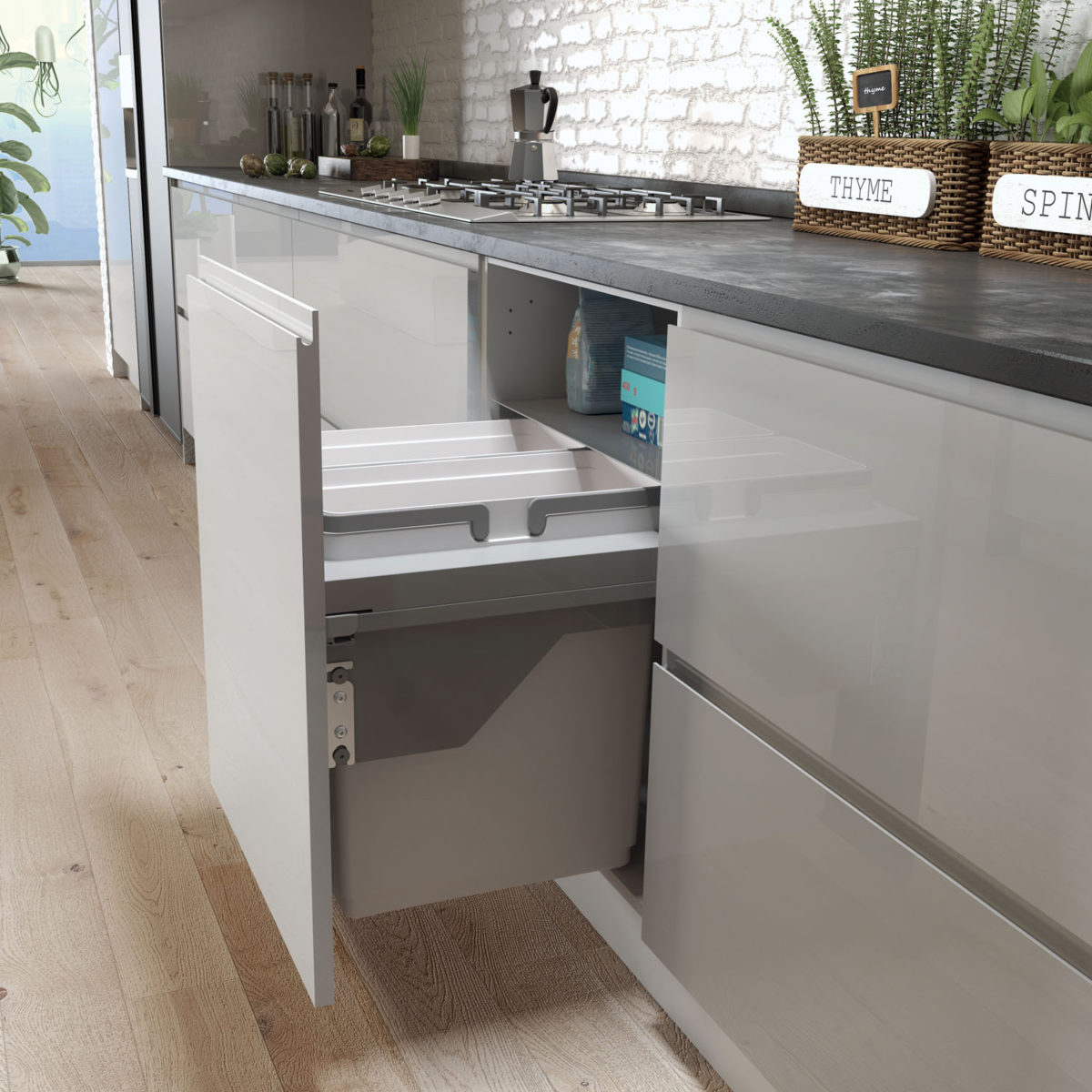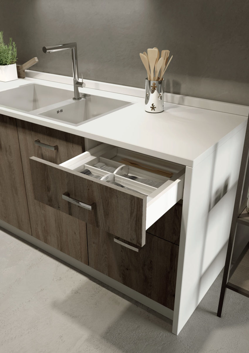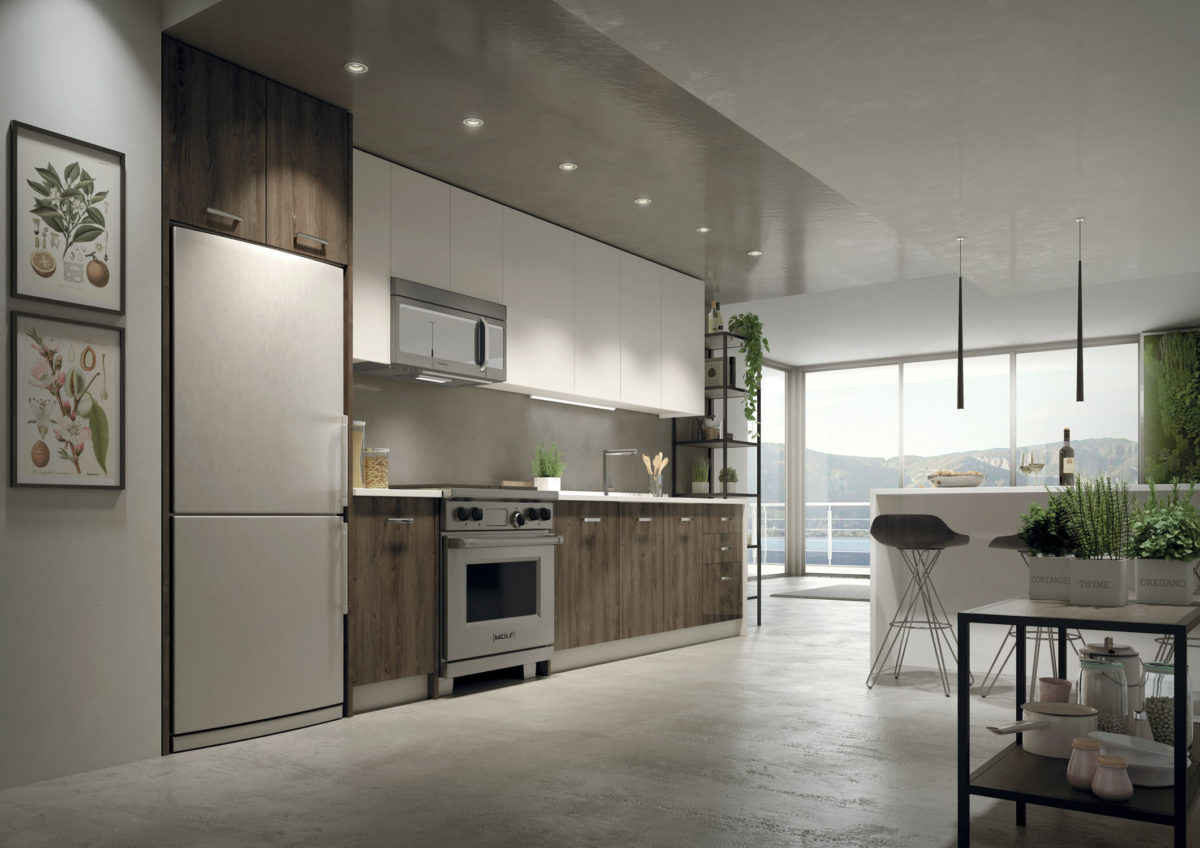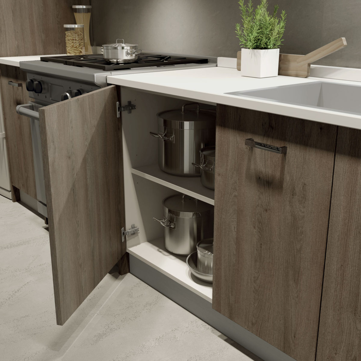 Linear composition with bases and column with flat doors in Melamine Rovere Seppia finish, wall units with flat doors in Gloss Lacquered Cortina White finish.