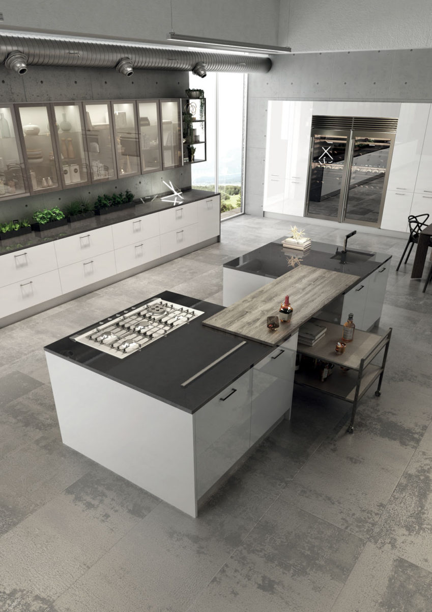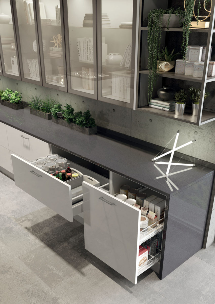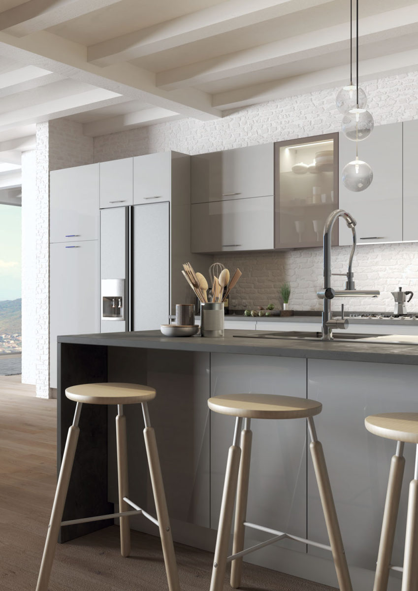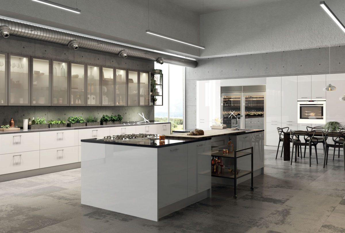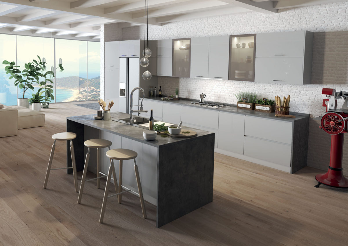 Linear composition with bases and island with integrated handle door, columns and wall units with flat doors in Gloss Lacquered Alps Gray finish. 2 wall units with Glass doors.