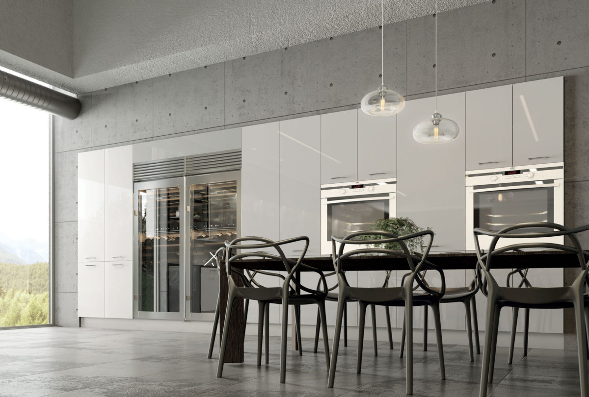 Composition with bases and columns with flat doors in Gloss Lacquered Cortina White finish, wall units with glass doors.