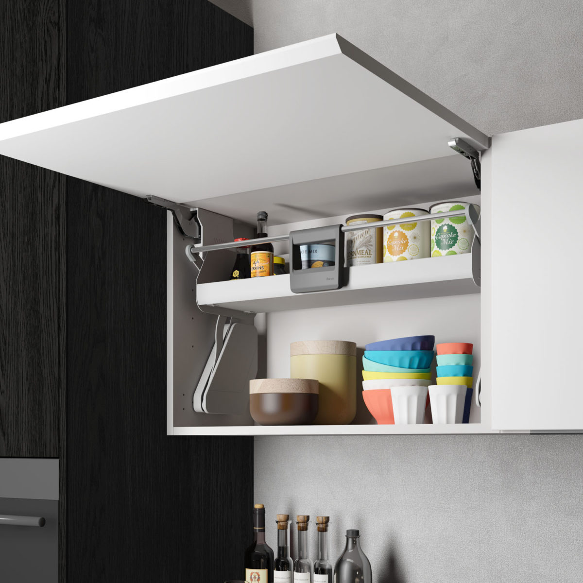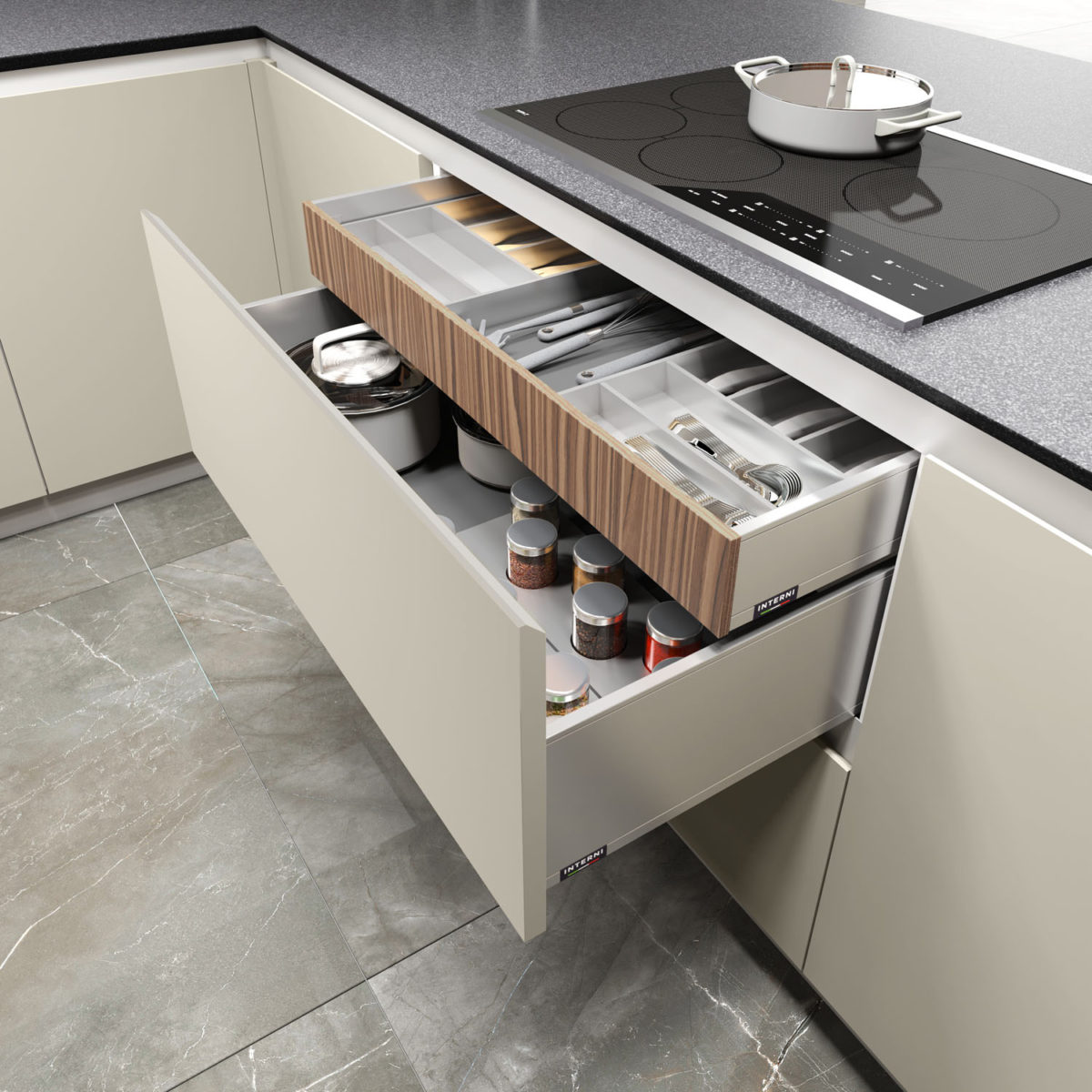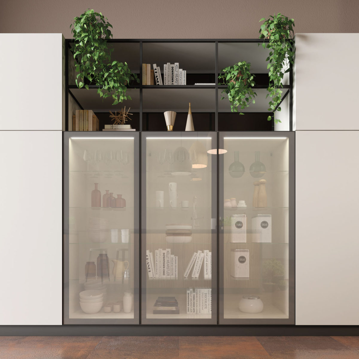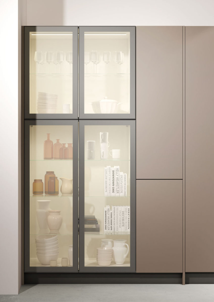 Composition with bases and columns with 45° doors in Matt Lacquered Sabbia finish, wall units with glass doors. Columns in Impiallacciato Noce Pre Composto.