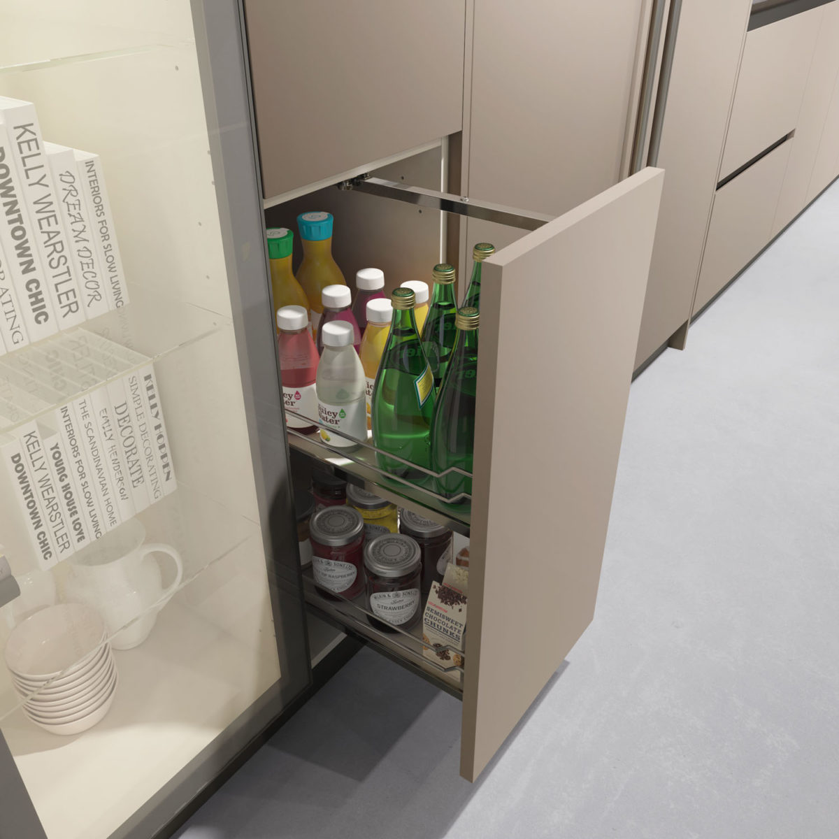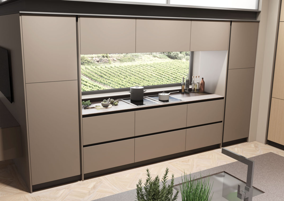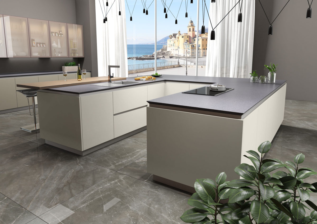 Linear composition with bases and island with 45° door, columns and wall units with 45° doors in Matt Lacquered Sabbia finish. 2 wall units with glass doors.