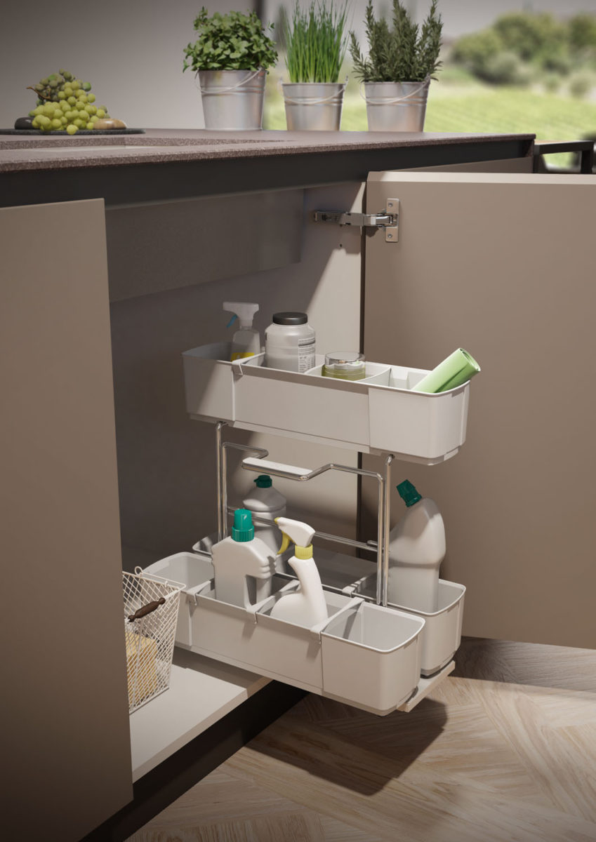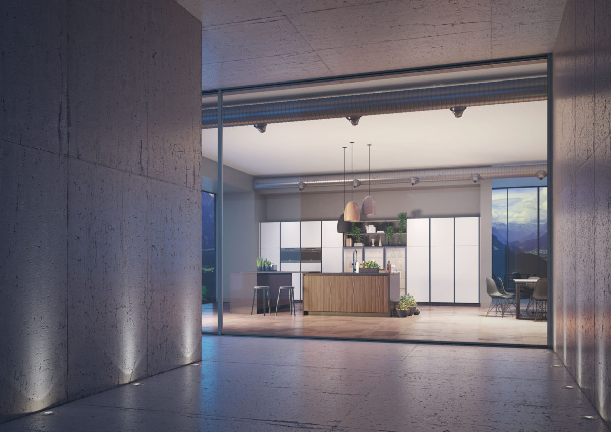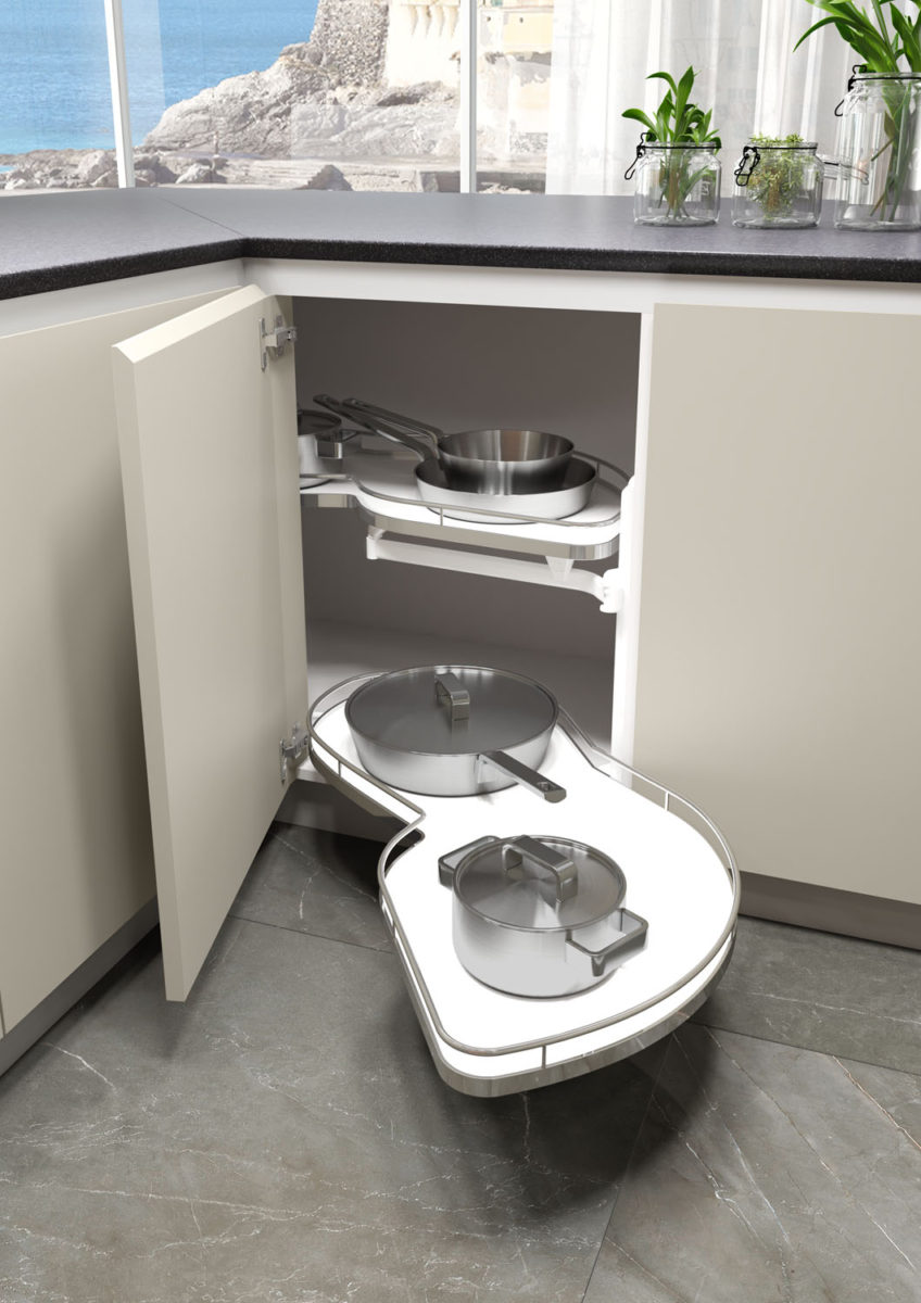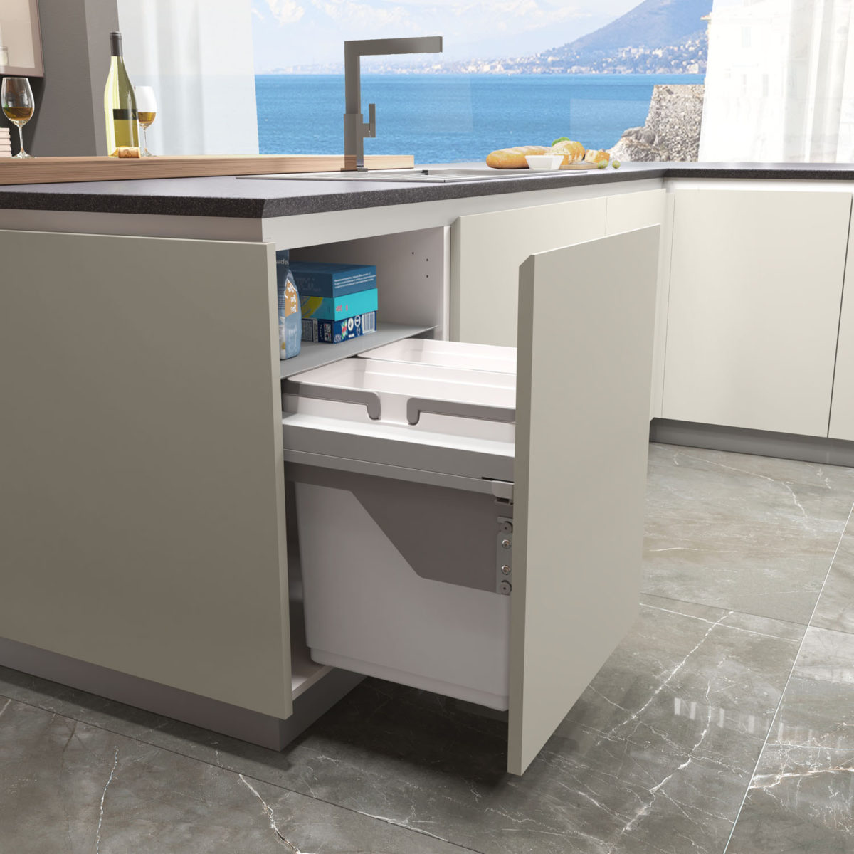 Linear composition with bases and island with 45° door, columns and wall units with 45° doors in Matt Lacquered Sabbia finish. 2 wall units with glass doors.