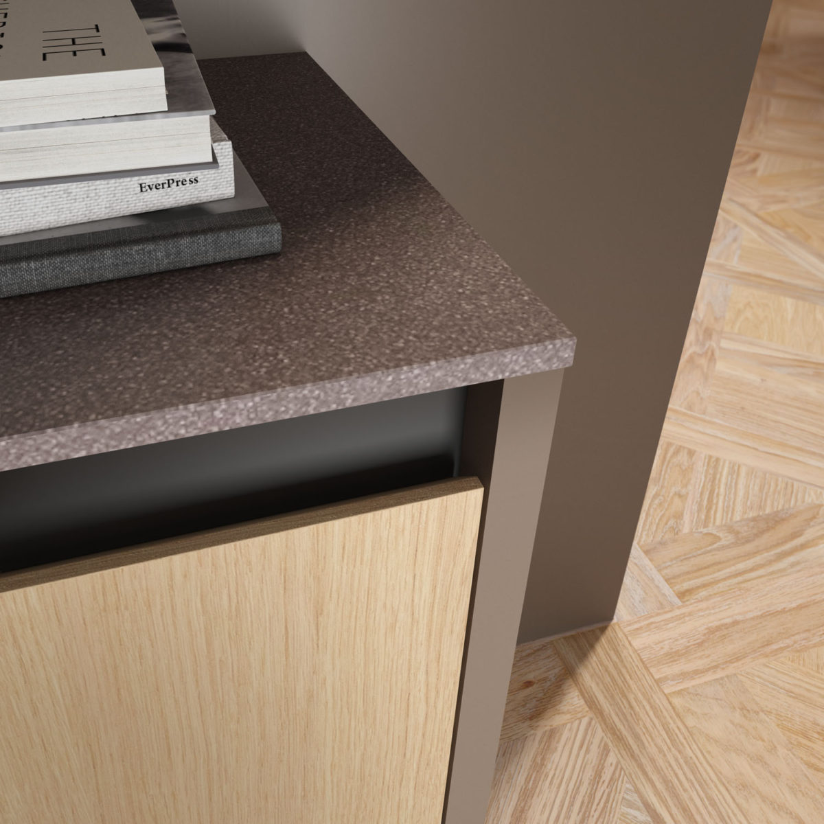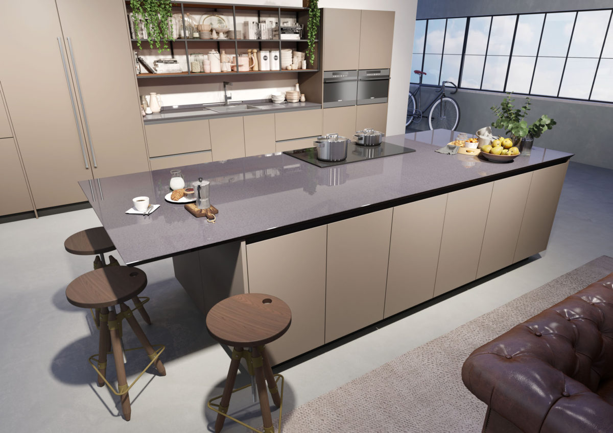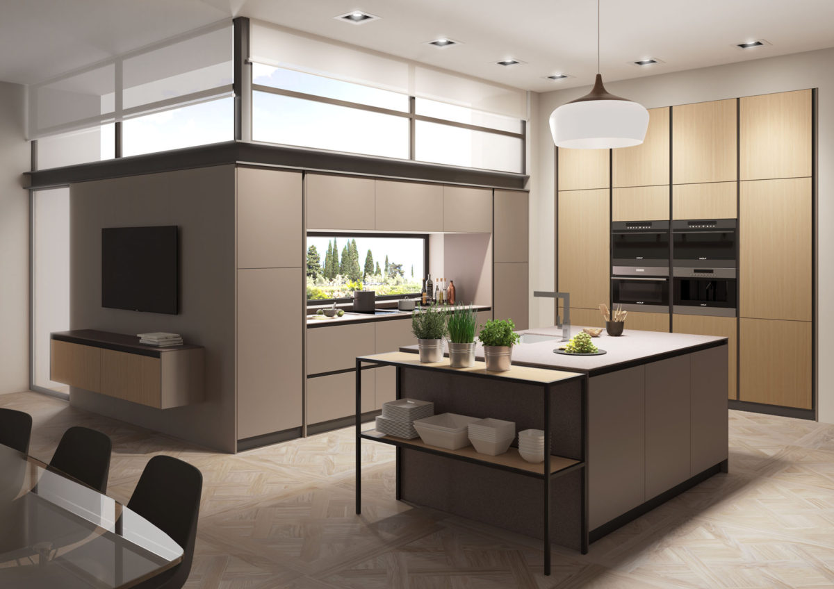 Composition with wall units, bases and island with 45° doors in Matt Lacquered Fango finish, columns with 45° handles in Impiallacciato Rovere Naturale, hanging unit with 45° doors in Rovere Naturale.