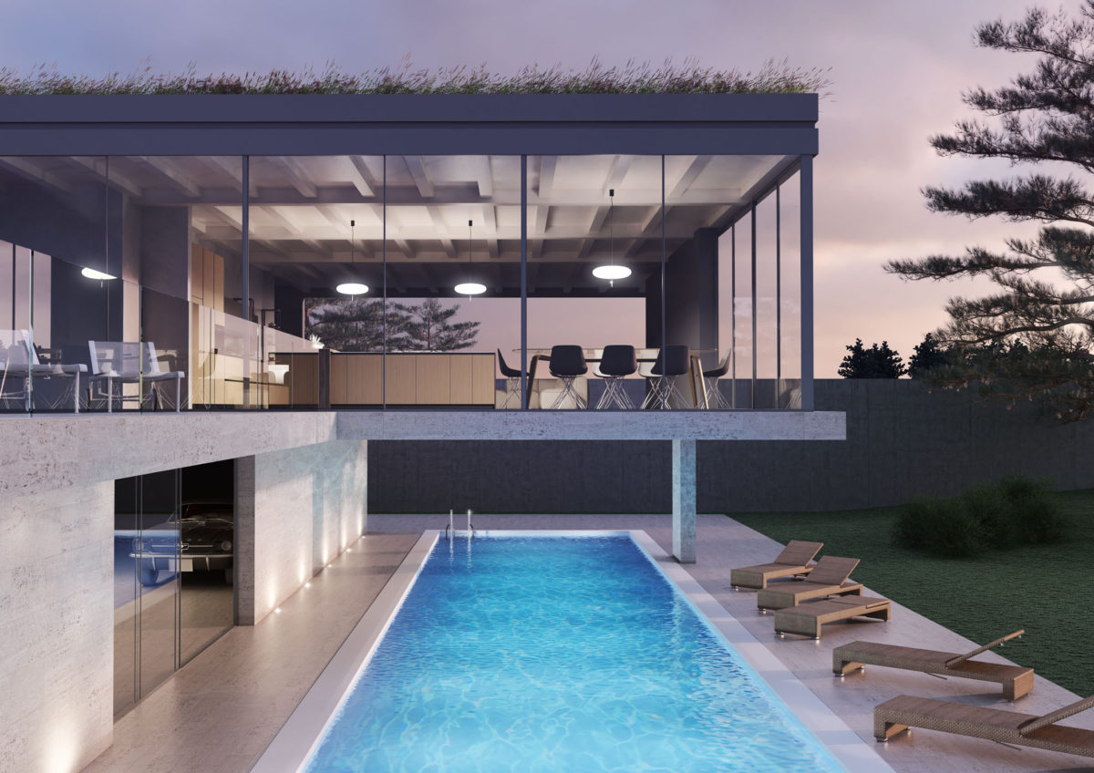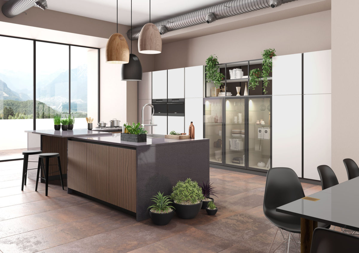 Composition with bases and columns with flat doors in Matt Lacquered Bianco finish, pantry units with glass doors, island in Impiallacciato Noce Pre Composto.