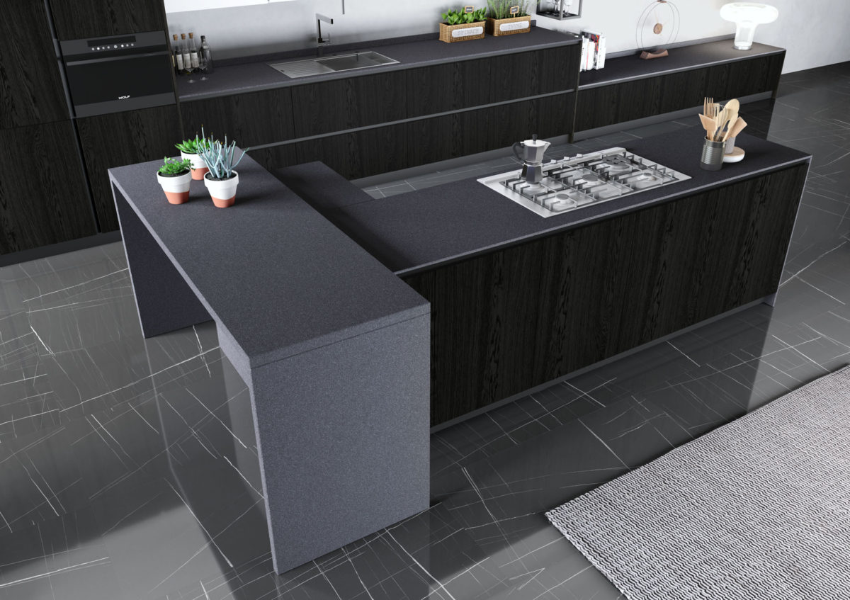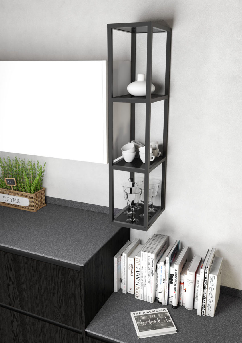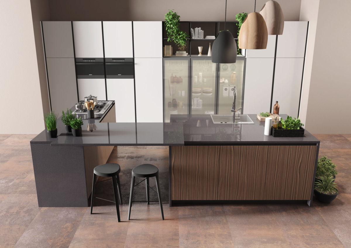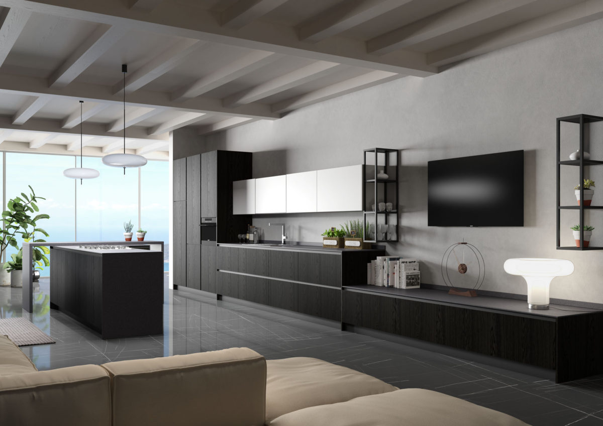 Linear composition with bases and island with 45° doors, columns and base units in Impiallacciato Rovere Naturale varnished in custom color (Nero china Opaco). 4 wall units in Matt Lacquered Bianco finish.